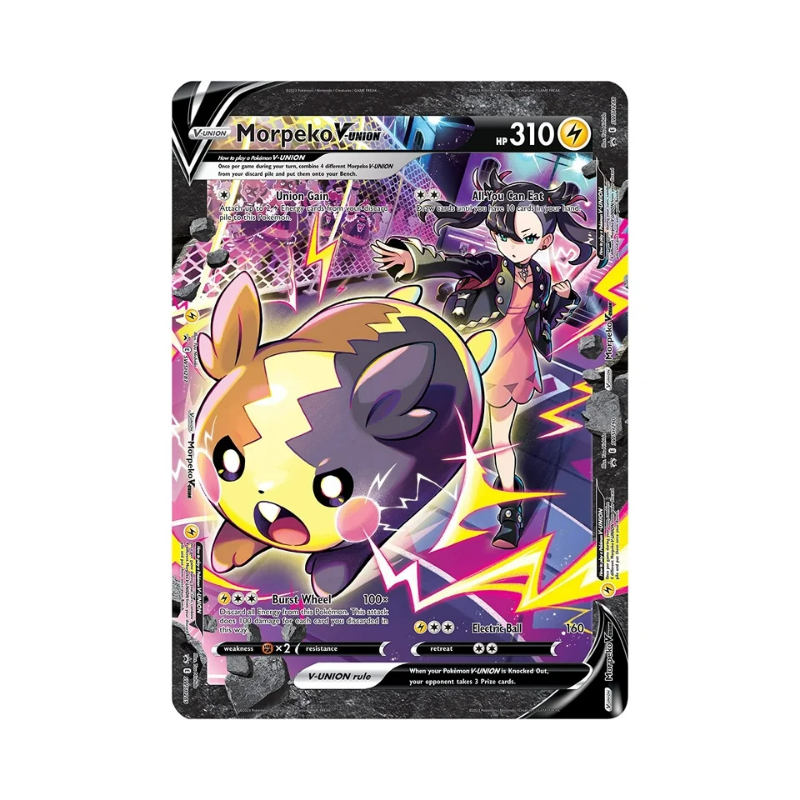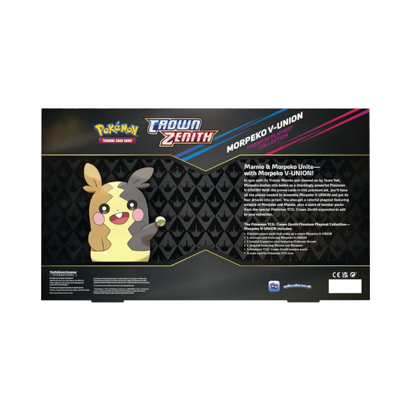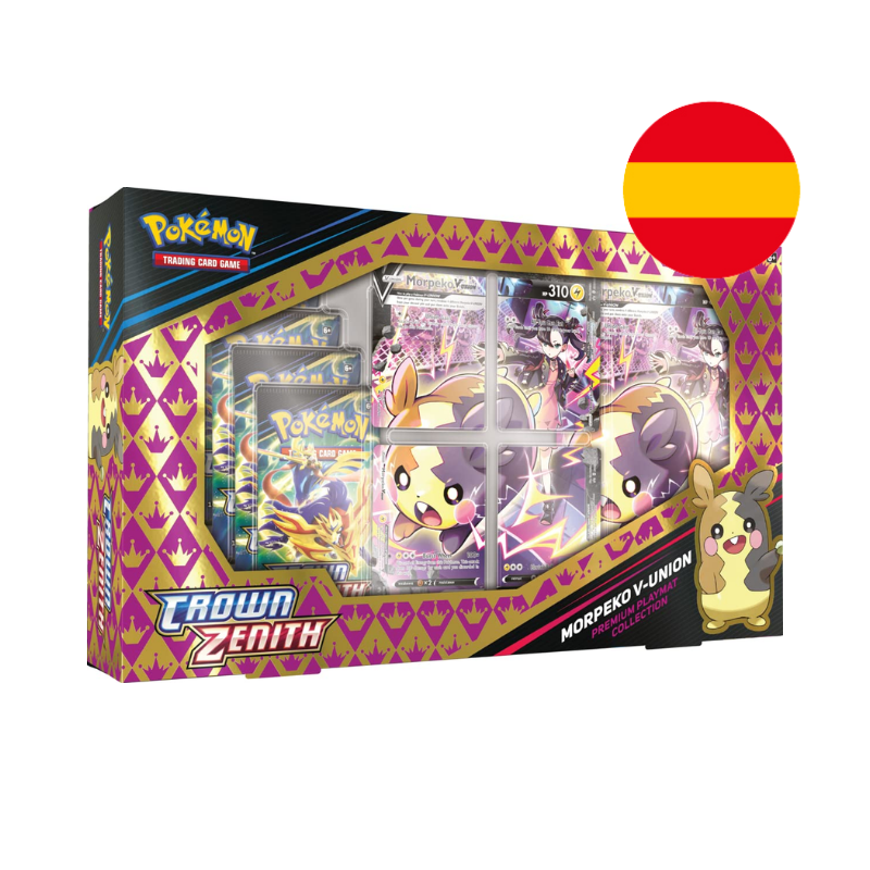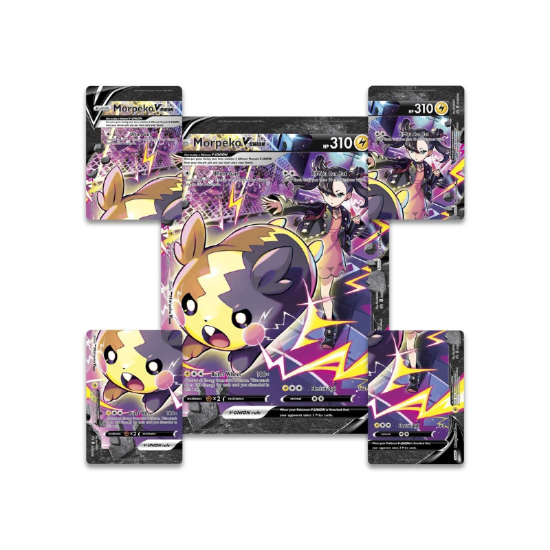 ¡La energía de Morpeko se desata en una colección única! La Colección de Morpeko V-UNION de Cénit Supremo incluye las cuatro cartas exclusivas que forman a Morpeko V-UNION, una carta promocional de gran tamaño para tu vitrina, y varios sobres de expansión de la serie Cénit Supremo.
