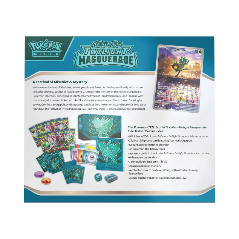 - Esta es la ETB estándar (9 sobres). La Pokémon Center ETB incluye 11 sobres y dos promos de Teal Mask Ogerpon (una con sello Pokémon Center). Si vendes esa versión, acláralo en la ficha.